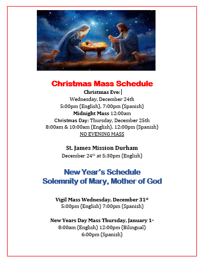 Sunday 8am, 10am (English) 12noon (Spanish) 5pm (English)
